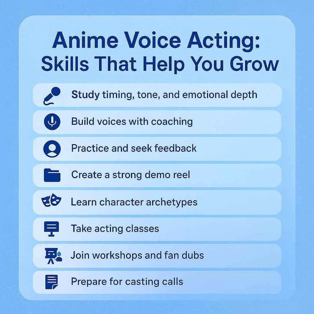 Anime voice acting improves when you study timing, tone, and emotional depth in animated characters.