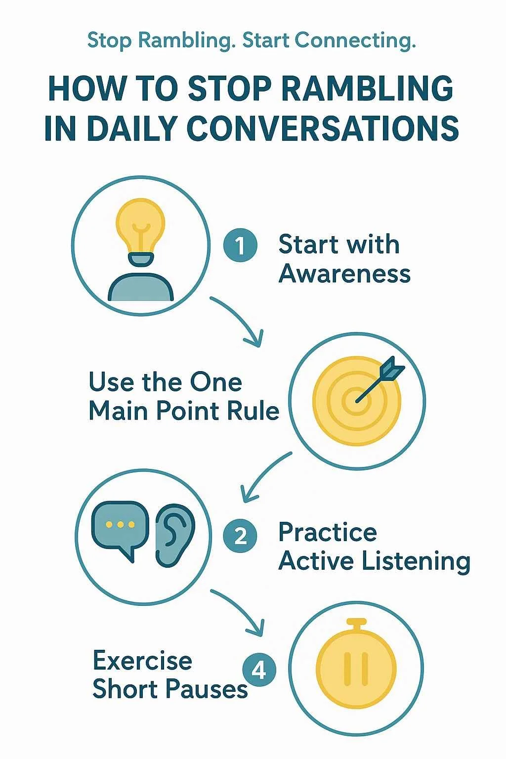 Rambling is a common habit, but it can be changed with awareness and practice. Focusing on one point at a time, slowing your speech, and using pauses helps your message stay clear and focused.