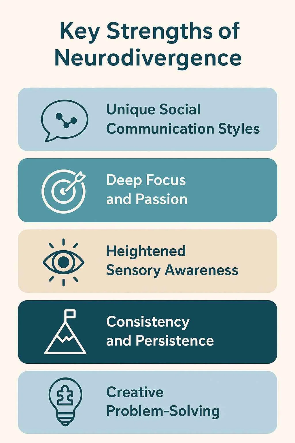 Many neurodivergent people have strengths such as deep focus, pattern recognition, and creative problem-solving.