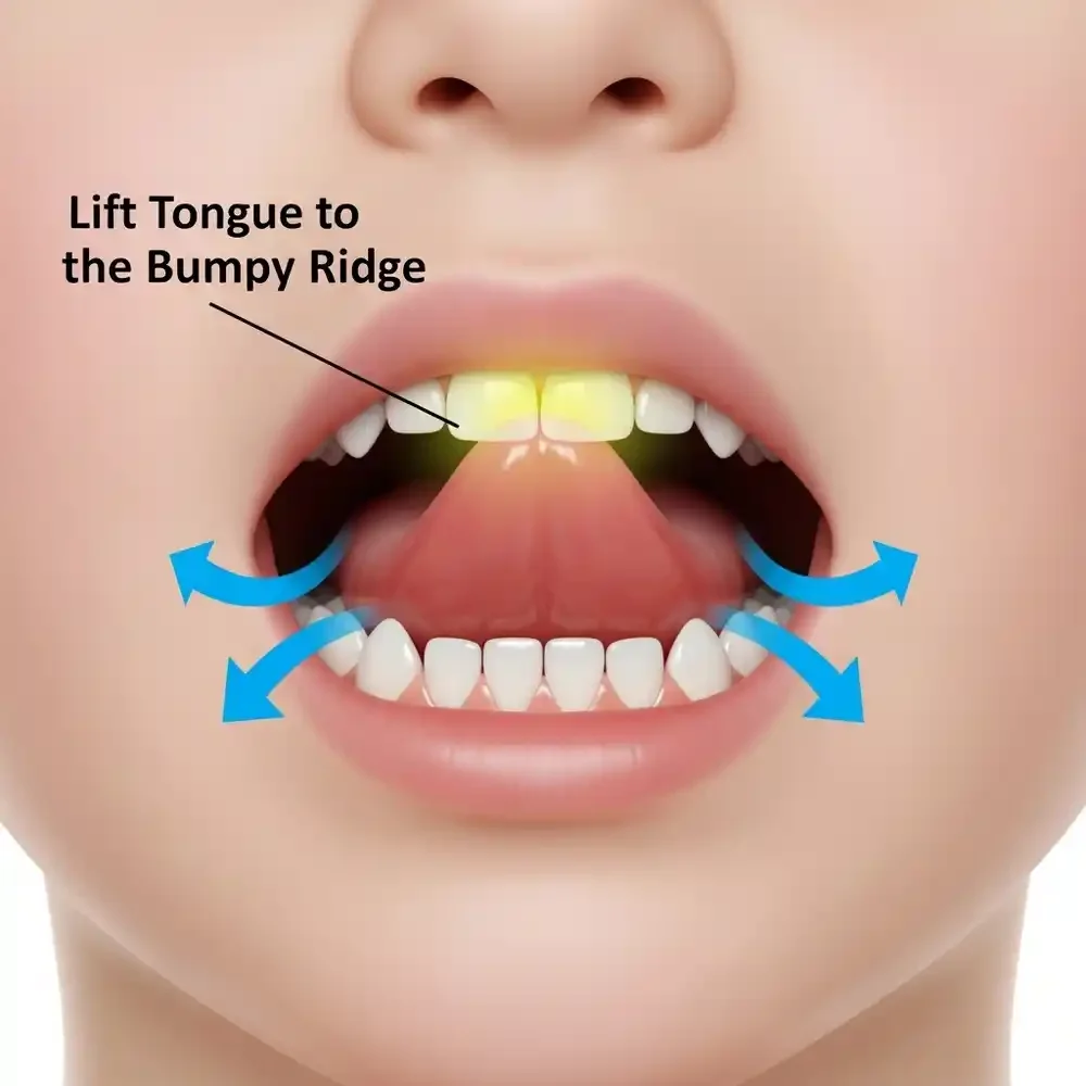 Lift the tip of the tongue to the alveolar ridge (the bumpy part right behind the front teeth or top teeth).